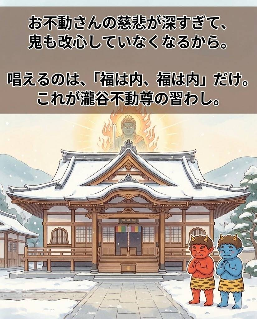 瀧谷不動尊の節分で、ある「作法」に驚かれる方がいらっしゃいます。 それは、豆をまく時に**「鬼は外」と言わず、「福は内、福は内」とだけ唱える**ことです。✨