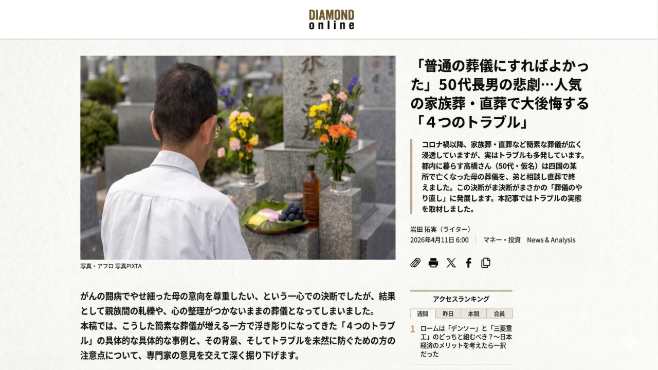 ▼ 参考記事 「普通の葬儀にすればよかった」50代長男の悲劇…人気の家族葬・直葬で大後悔する「4つのトラブル」 ダイヤモンド・オンライン(2026年4月1日、著:岩田いく実) https://diamond.jp/articles/-/386987