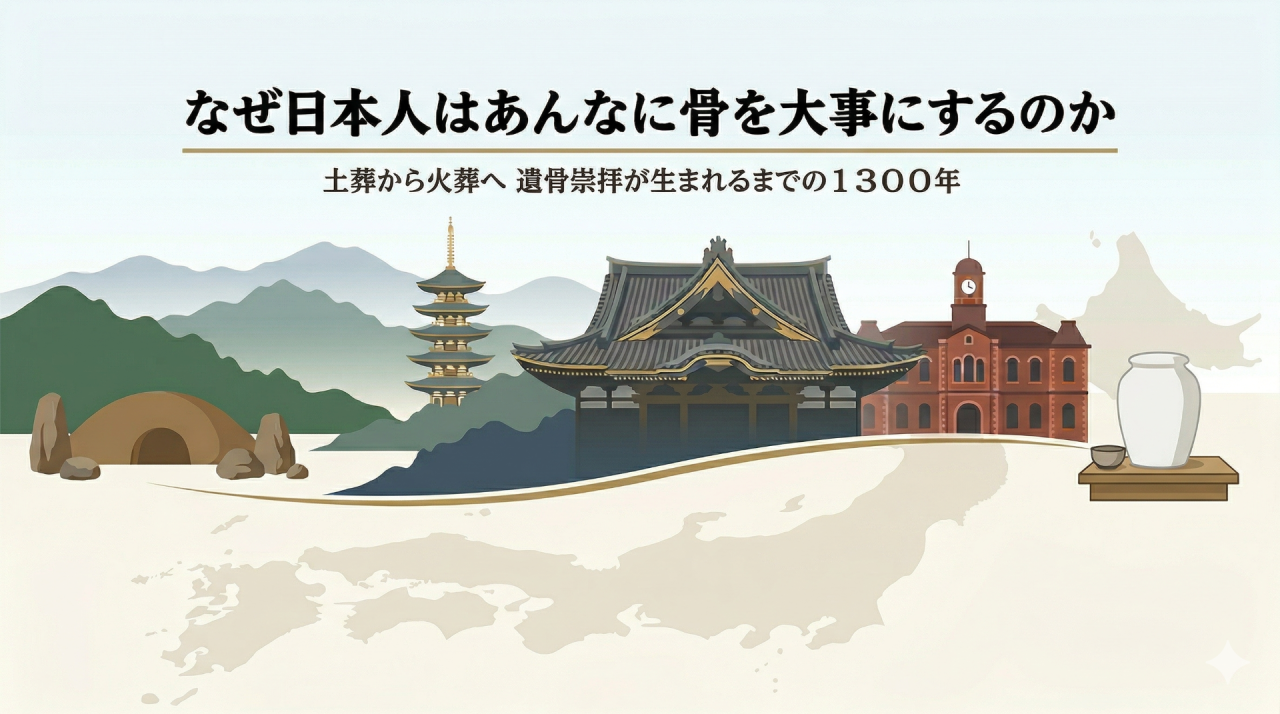 お骨を粗末にすることは、そこに宿る故人の魂を粗末にすること——そういう感覚がこの時代から生まれていきます。また日本古来の「祖霊信仰」——祖先の霊が子孫を見守ってくれるという考え——も重なって、「骨=故人そのもの」という独自の観念が形成されていったのです。