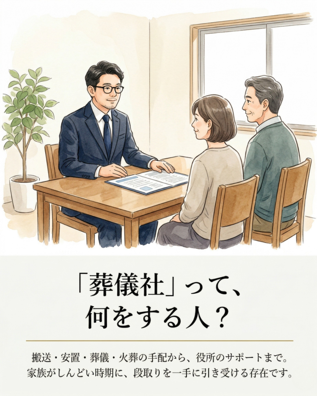 家族がしんどい時期に、段取りを一手に引き受ける存在です。「何をお願いすればいいか分からない」という状態でも大丈夫。それを一緒に整理するところから、始めます。