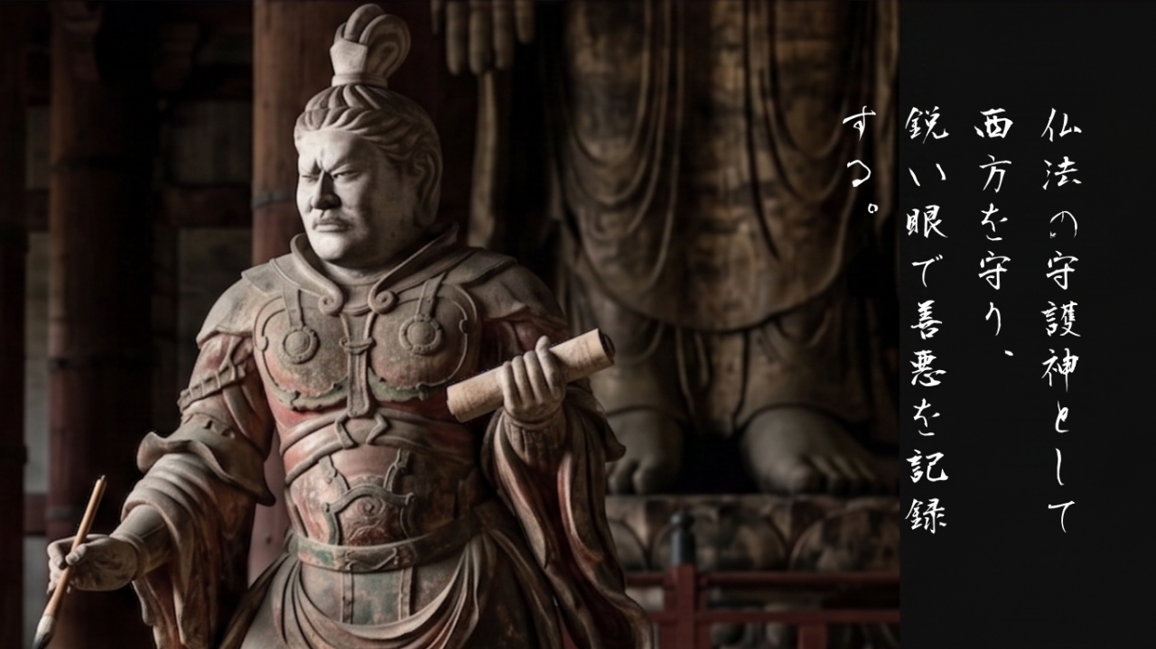 仏教が戒める怒りとは、自分の感情を爆発させて誰かを傷つけるものです。しかし広目天の怒りは、その対極にある。自分の欲や怒りを完全に制御した上で、それでも「許してはならないこと」に対して眼光を向け続ける——それは煩悩としての怒りではなく、慈悲が怒りの形をとったものです。