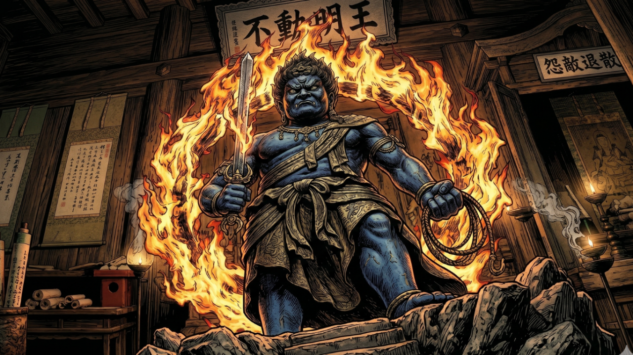 右手の剣は、迷いを断ち切るため。背後の炎は、あらゆる障壁を焼き尽くすため。そして左手の縄は、放さないための慈悲の綱です。